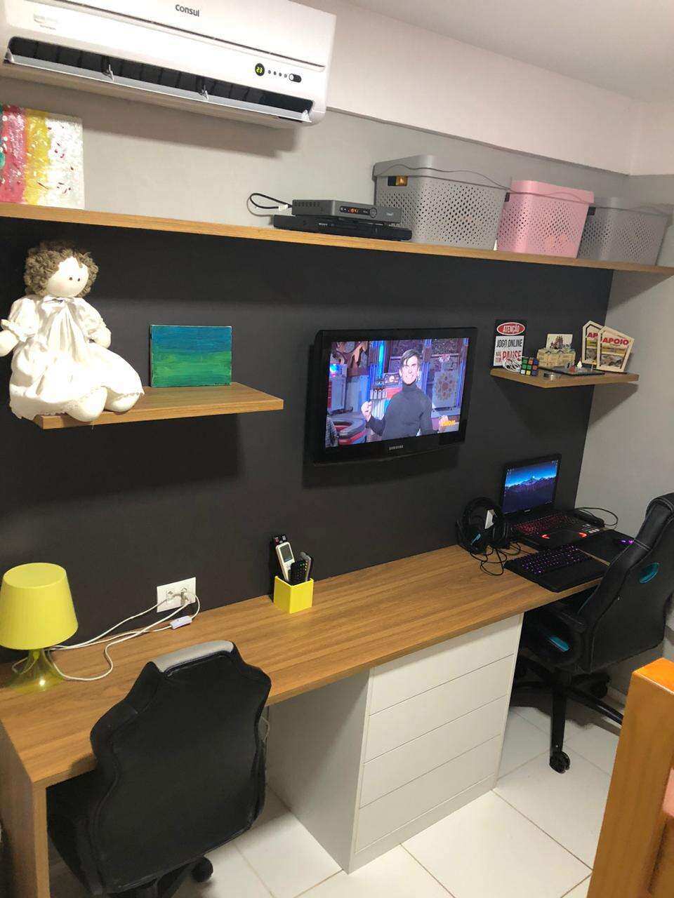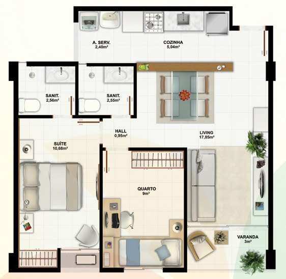 Aconchegante apartamento com 2 quartos, sendo 1 suíte, 61 m², varanda, sala, cozinha americana, banheiro social. O apartamento está finamente decorado com móveis planejados de muito bom gosto, possui uma vaga de garagem coberta e fechada.