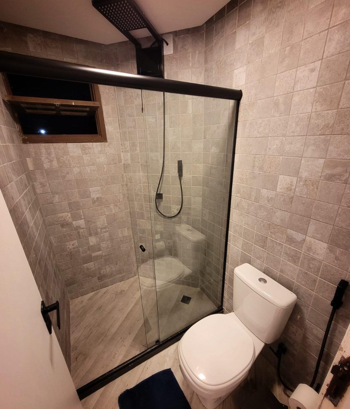Primeiro Pavimento - Um quarto com uma cama de casal e outra de solteiro e ar condicionado split, banheiro social sala com sofá-cama, ventilador de teto, cozinha gourmet e área de serviço.